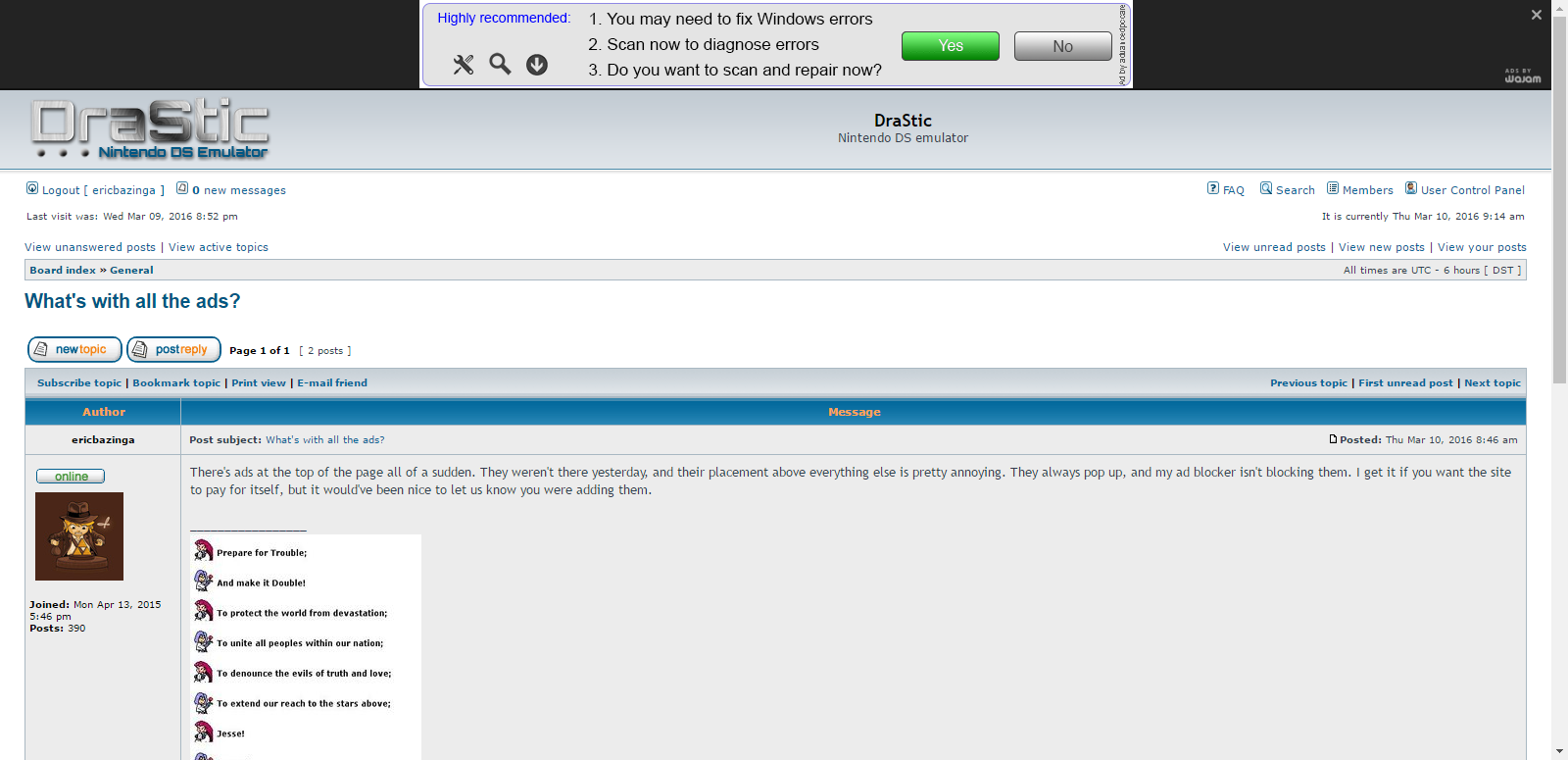 Likely adware or a PUA which adds AD code into page HTML client side. For some reason, some antiviruses don't detect those types. Use Avira or Avast! if you want protection agaisnt that with a realtime shield. Id say Avira as it's less intrusive when asking you to upgrade to premium. Or just use Windows 10 so you have windows defender antimalware built in.Jay Haru wrote:ericbazinga wrote:Googled it. Yup, I had a virus. Some shit called Wajam...Lordus wrote:We didn't (and wouldn't) add any ads to this site and I don't see any.